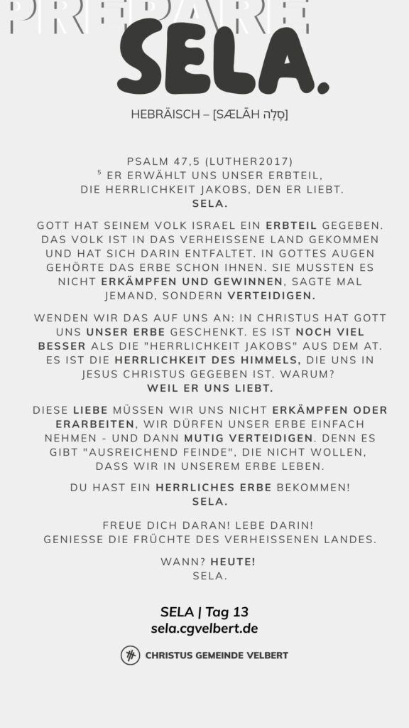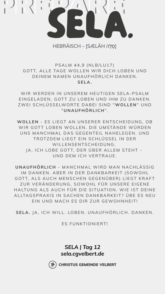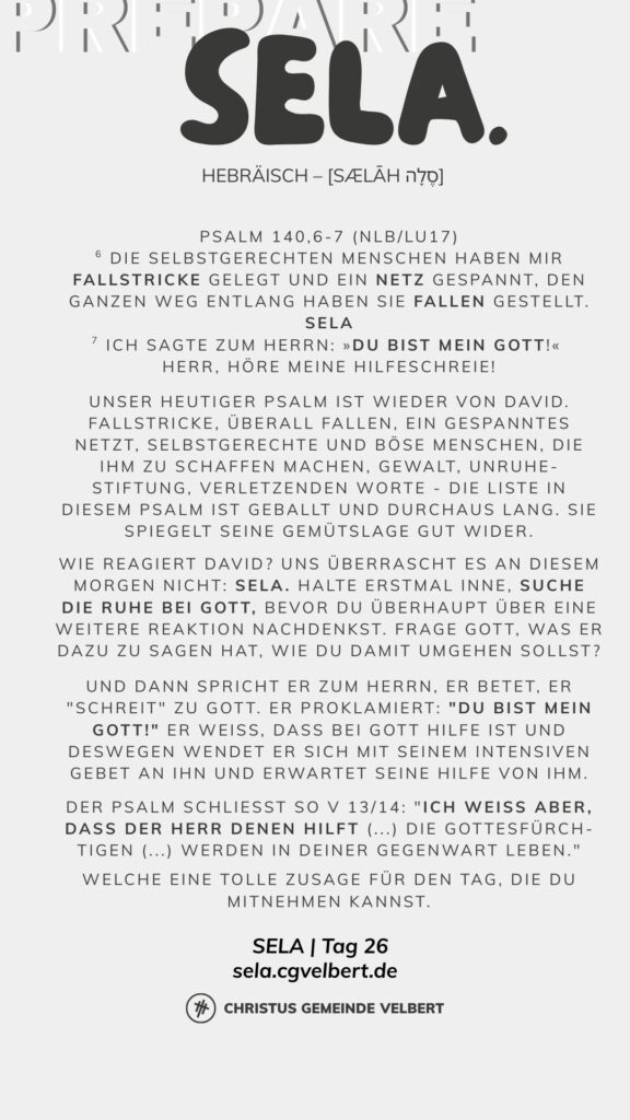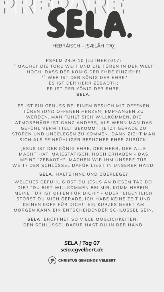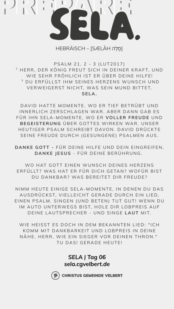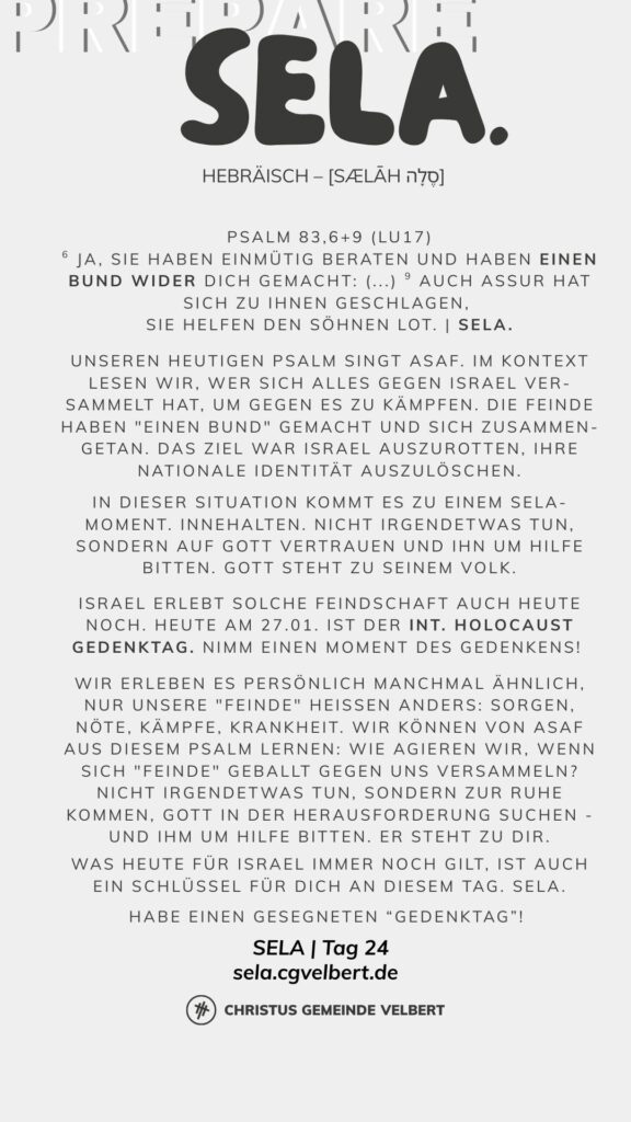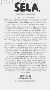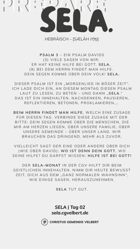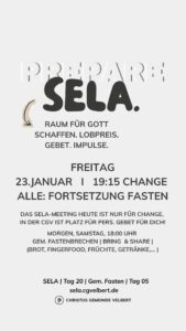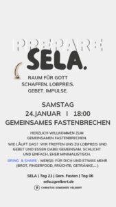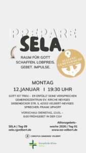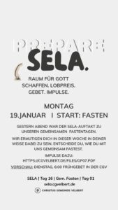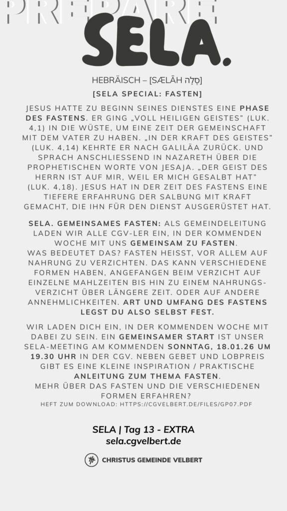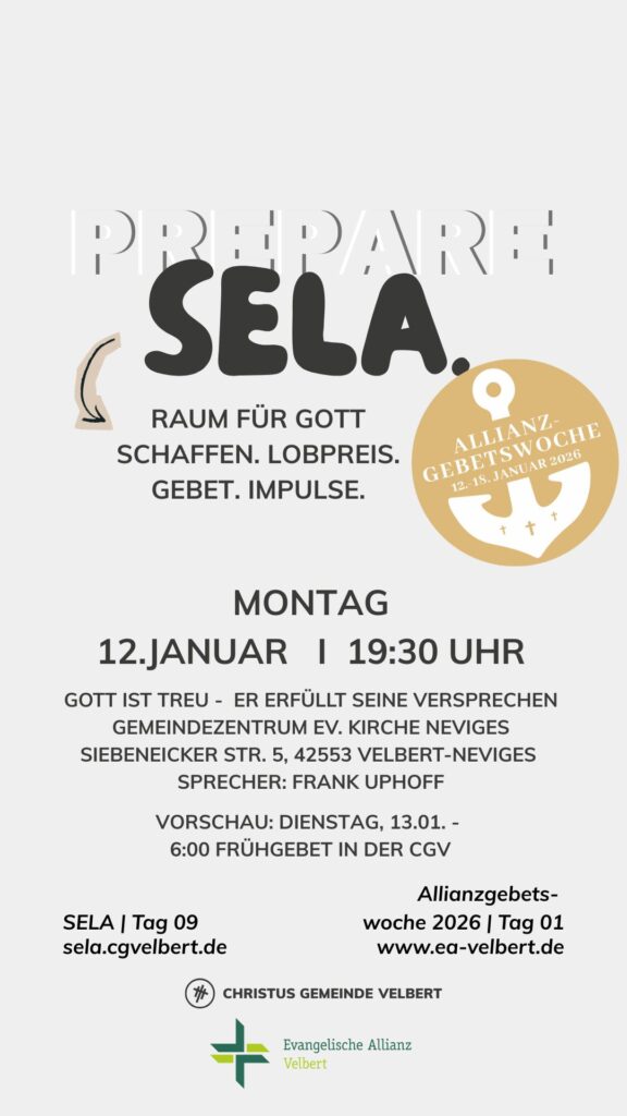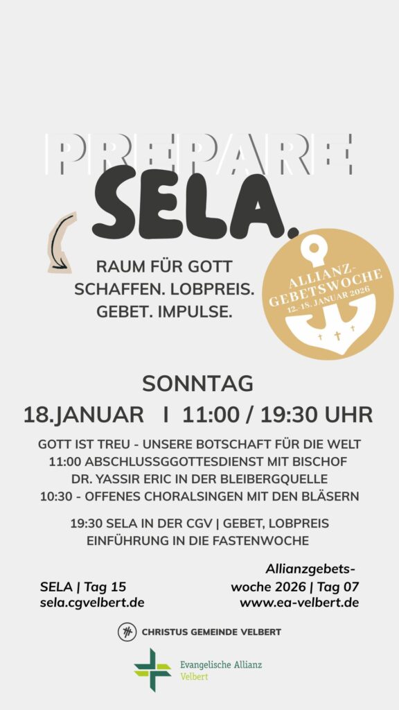 Als CGV wollen wir gemeinsam einen Monat „SELA“ ausrufen und genießen. Dafür schaffen wir im Monat Januar 2026 Raum. Und wir möchten dich ermutigen, das für dich persönlich auch zu tun.