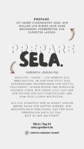 Unser Visionswort 2026, das uns leiten soll ist PREPARE (Englisch: Vorbereitung). Dieses haben wir in der Leitungsklausur im November 2025 für das Jahr 2026 bekommen. Ein besonderer Impuls für Januar für die Vorbereitung auf das Jahr 2026 war: SELA.