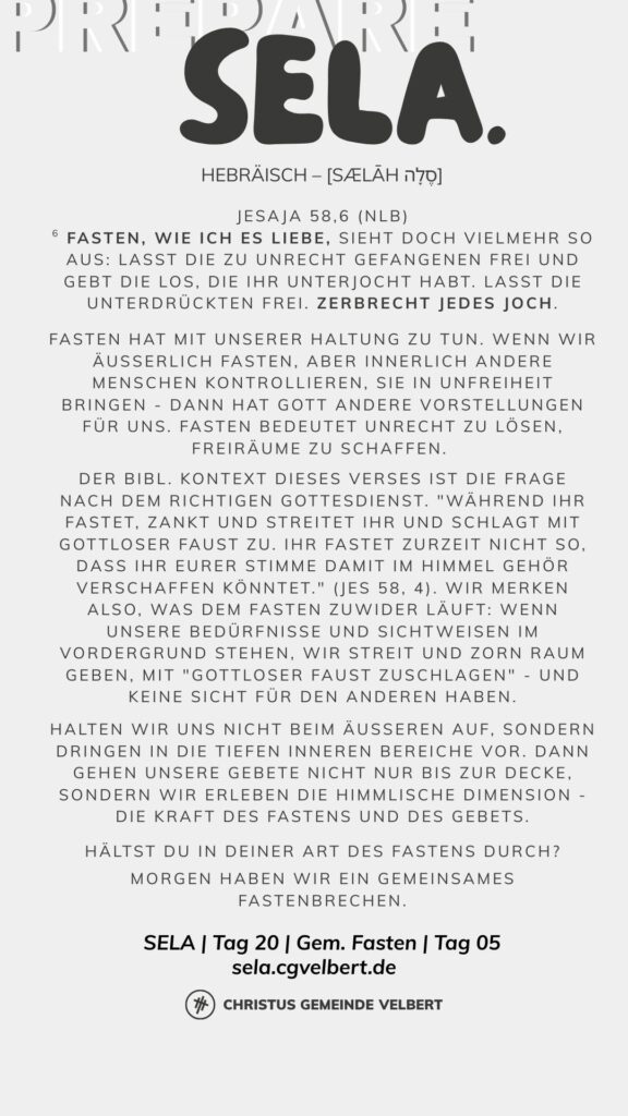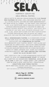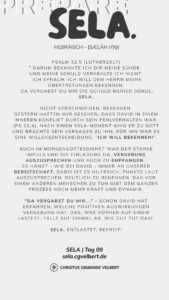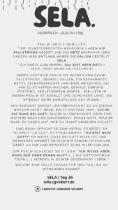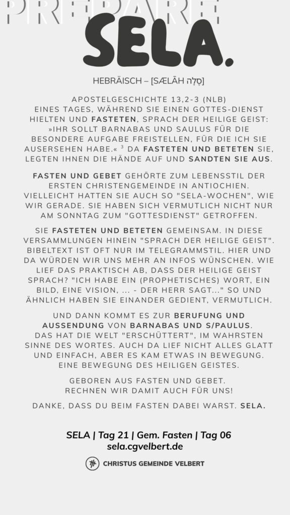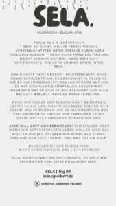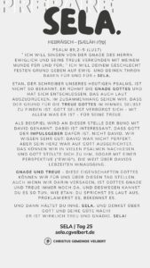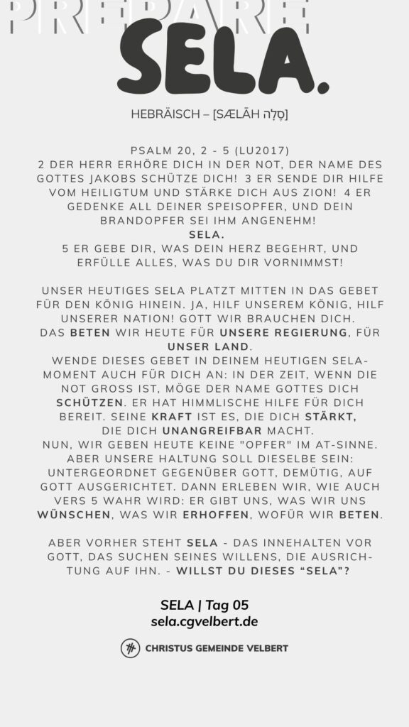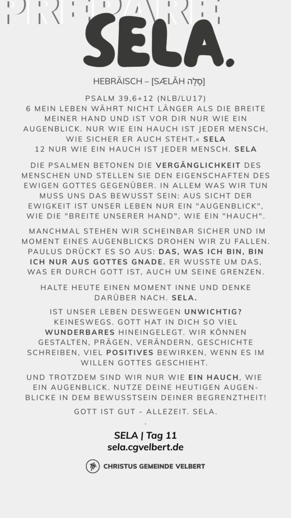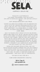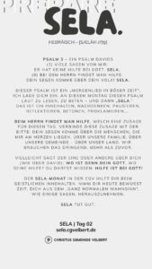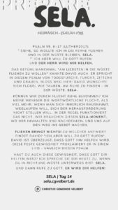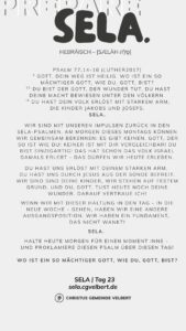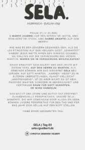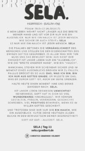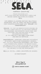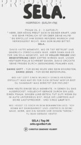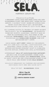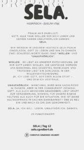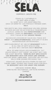 In den Psalmen finden wir immer wieder den hebräischen Begriff SELA [סֶלָה sælāh] – bedeutet ‚Pause‘ – ein Moment des Innehaltens. Im Zentrum steht das aufmerksame Wahrnehmen von Gottes Gegenwart, seinem Reden und Wirken im eigenen Leben. Der Fokus liegt auf der Vertiefung der Gottesbeziehung und dem geistlichen Wachstum.
