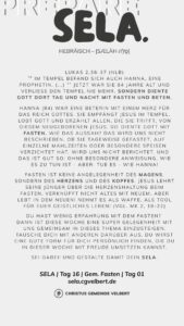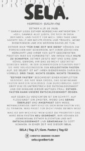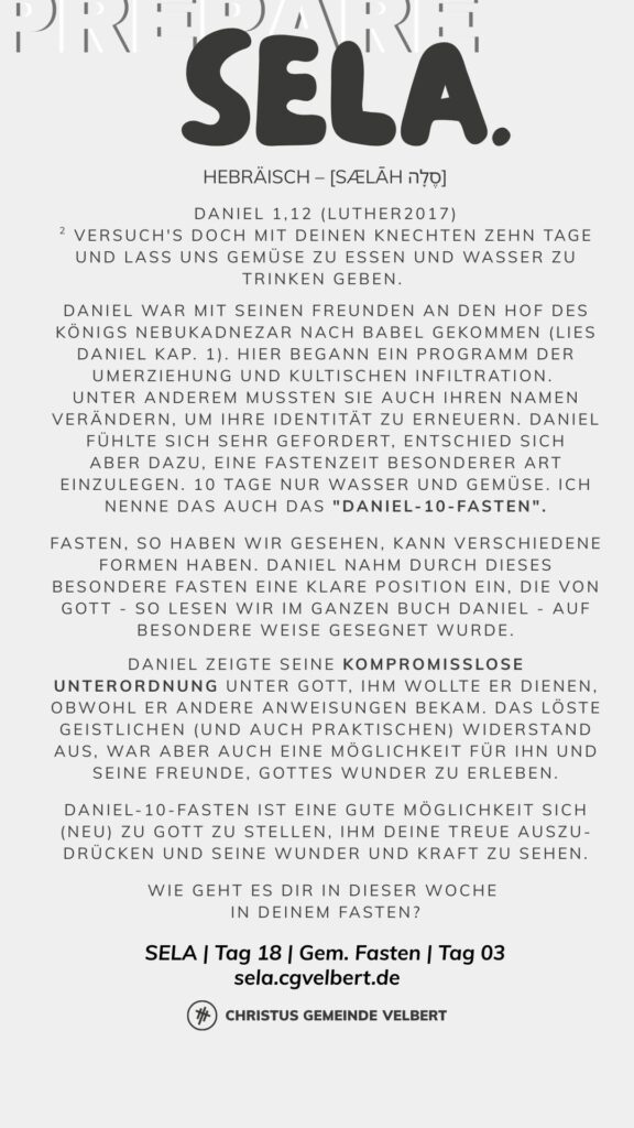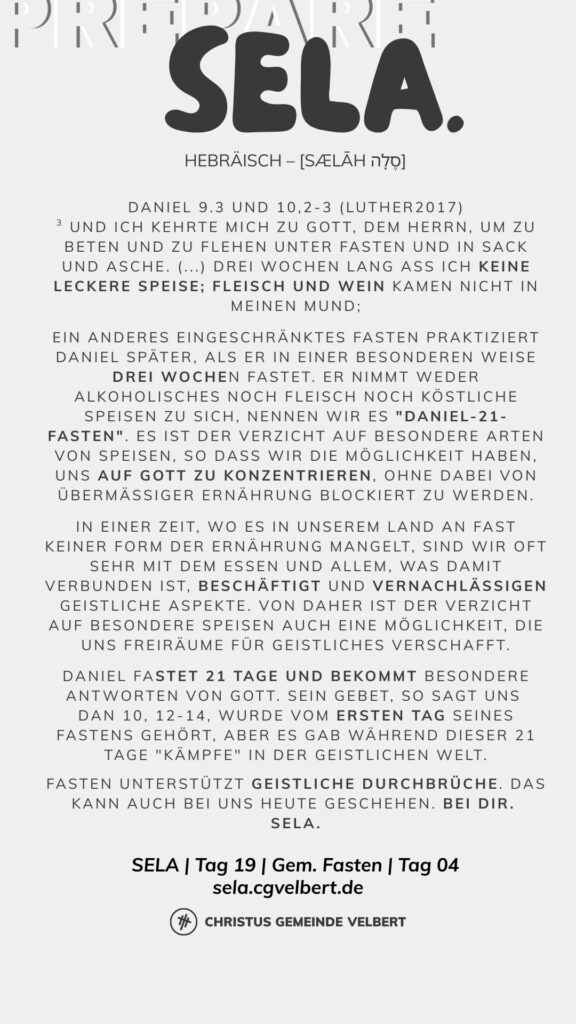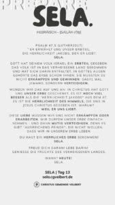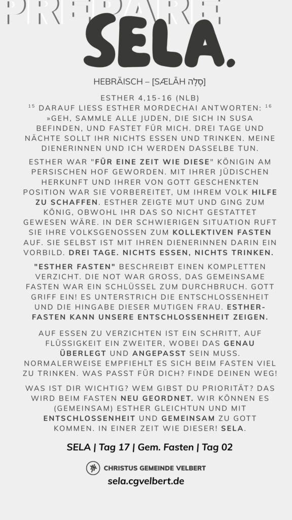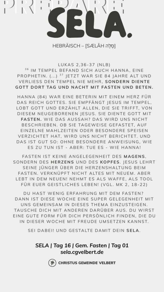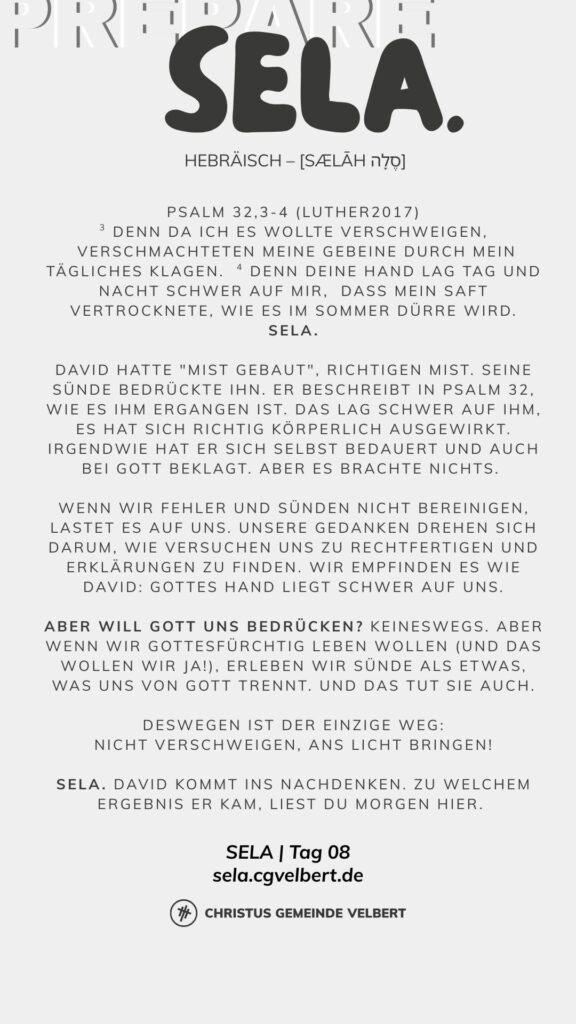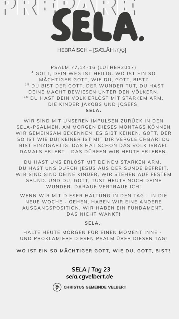 In den Psalmen finden wir immer wieder den hebräischen Begriff SELA [סֶלָה sælāh] – bedeutet ‚Pause‘ – ein Moment des Innehaltens. Im Zentrum steht das aufmerksame Wahrnehmen von Gottes Gegenwart, seinem Reden und Wirken im eigenen Leben. Der Fokus liegt auf der Vertiefung der Gottesbeziehung und dem geistlichen Wachstum.
