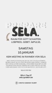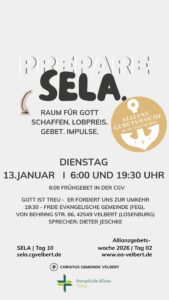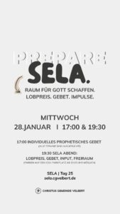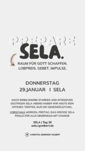 Richtig los geht es am Sonntag, 4.1.26. Wir feiern gemeinsam das Abendmahl und einige Personen werden eine kleine Einführung zu SELA geben, was die Vision ist und wie wir das machen werden.