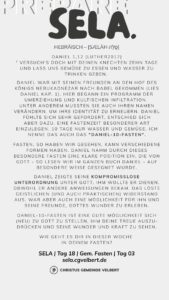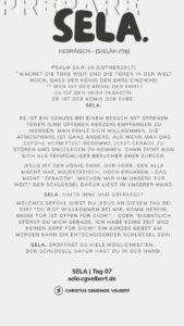 Für die „SELA-Zusammenkünfte“ wird i.d.R. kein großes Programm geplant. Es wird jemanden geben, der an den Sonntagen und den Abenden verantwortlich ist. Und jemand, der ein Lied anstimmen könnte und ggf. zwei, drei Lieder vorbereitet hat. Ansonsten wird nicht viel geplant oder geprobt. Komm – und suche Gott.